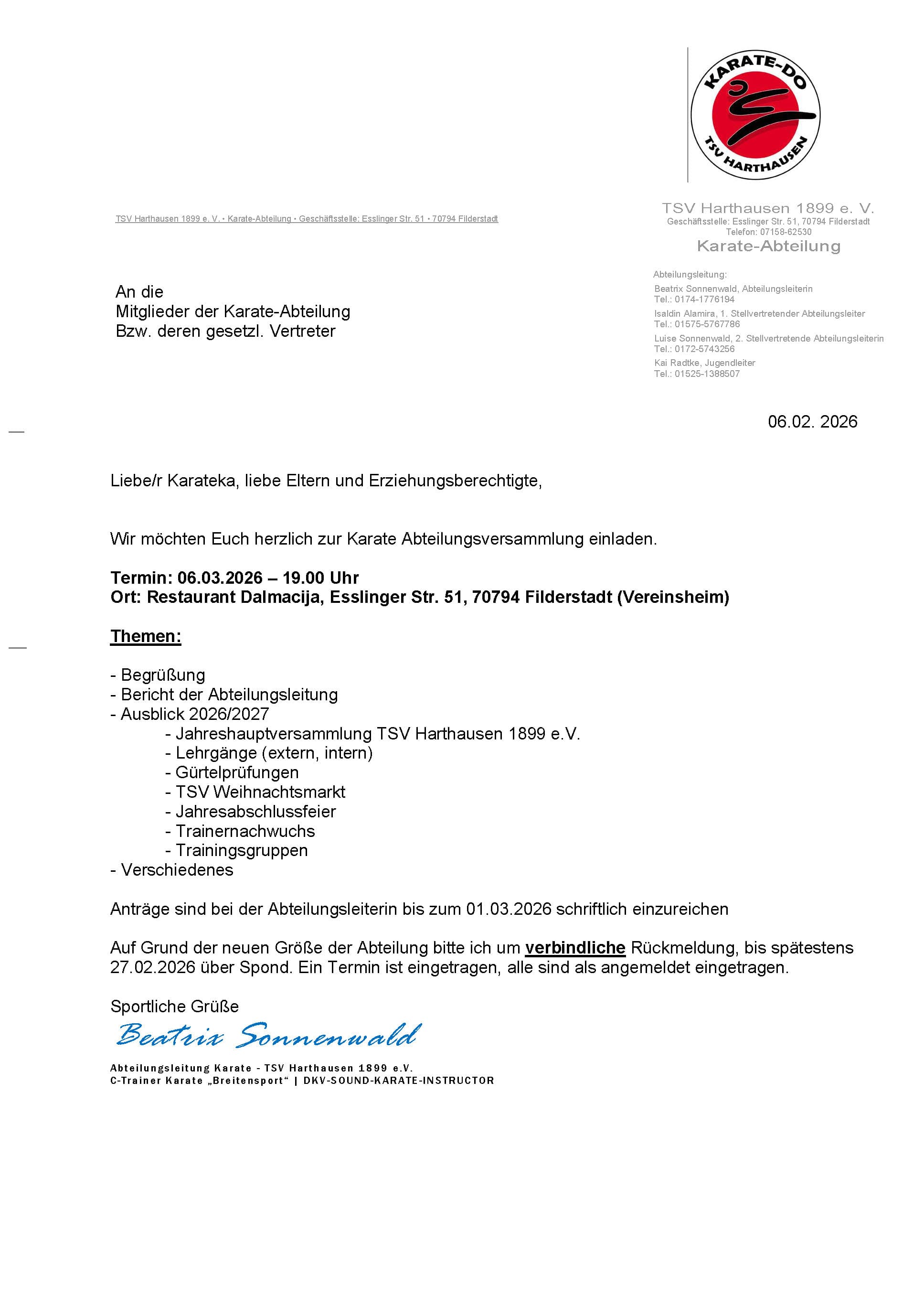 Wir möchten Euch herzlich zur Karate Abteilungsversammlung einladen.
