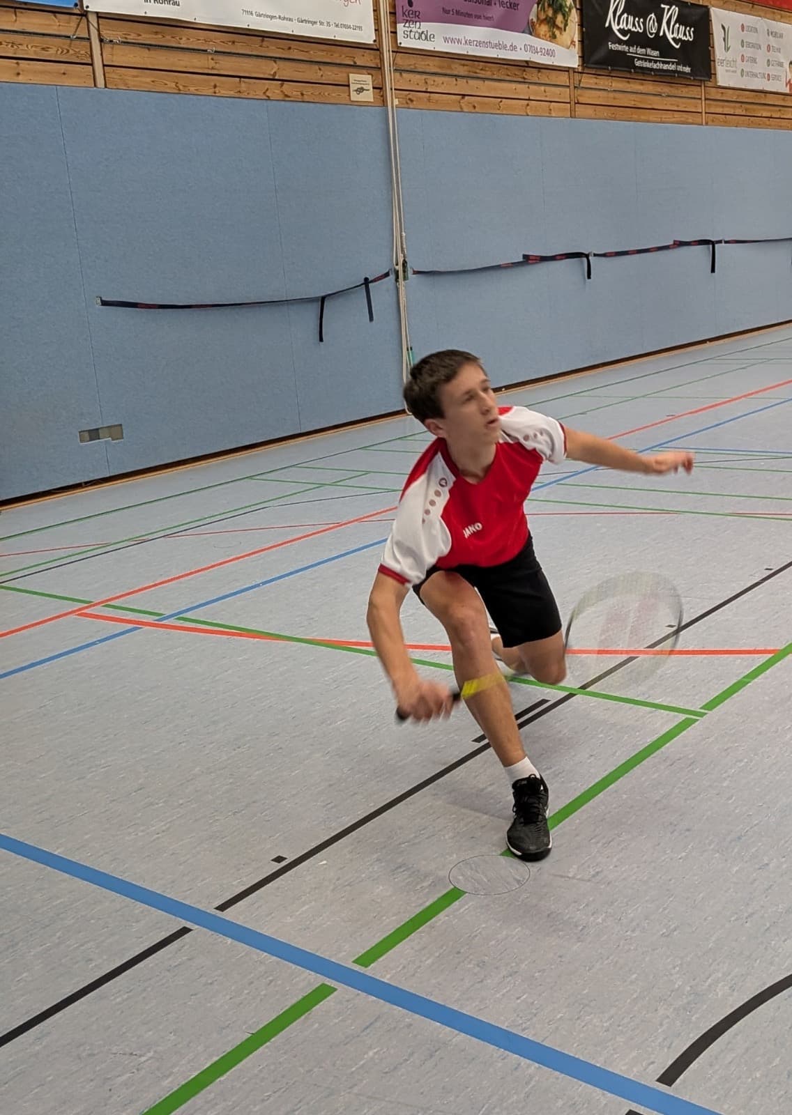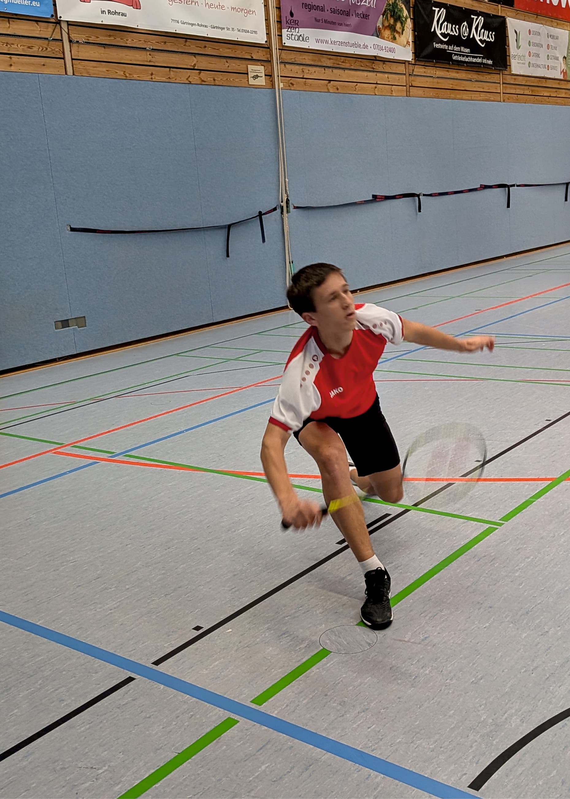 Max präsentierte sich in Topform. Nach einem Freilos war er in seinem ersten Spiel schon mental auf 100% und konnte sich gegen Venkat K. vom VFL Sindelfingen in 3 Sätzen durchsetzen. Gegen Pugalendhi K vom VfL Herrenberg unterlag er im Halbfinale unglücklich. Im kleinen Finale konnte Max noch einmal seine technischen und taktischen Fähigkeiten unter Beweis stellen und besiegte in einem hochklassigen Spiel Linus M. vom VfL Sindelfingen mit 21:12 und 21:17. Ein toller 3ter Platz war der verdiente Lohn.