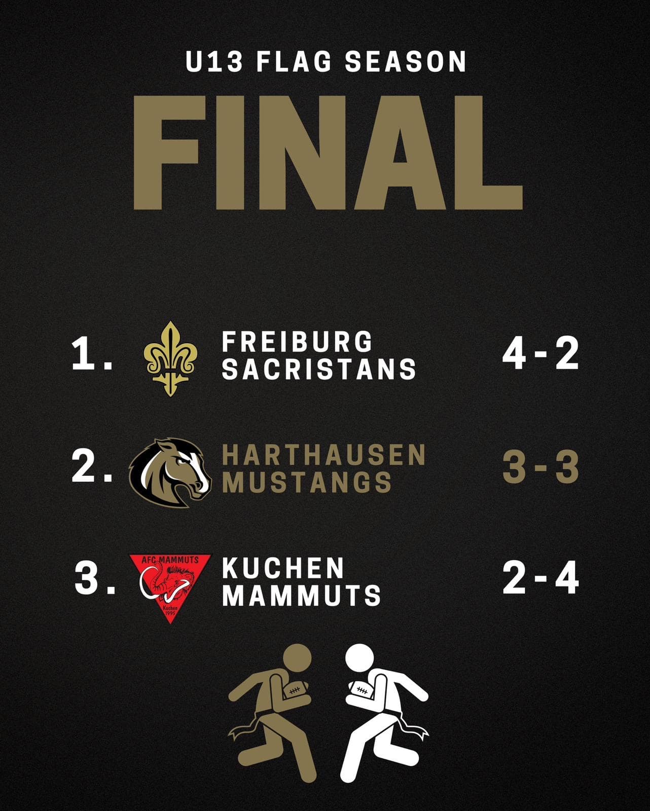 Wir gratulieren unserem American Football Nachwuchs zum zweiten Platz in ihrer ersten offiziellen U13 Flag Football Season . Während des Saisonverlaufs konnte die harte Arbeit der Coaches und der Nachwuchstalente aus den Trainingseinheiten sehr gut auf dem Feld umgesetzt werden.
