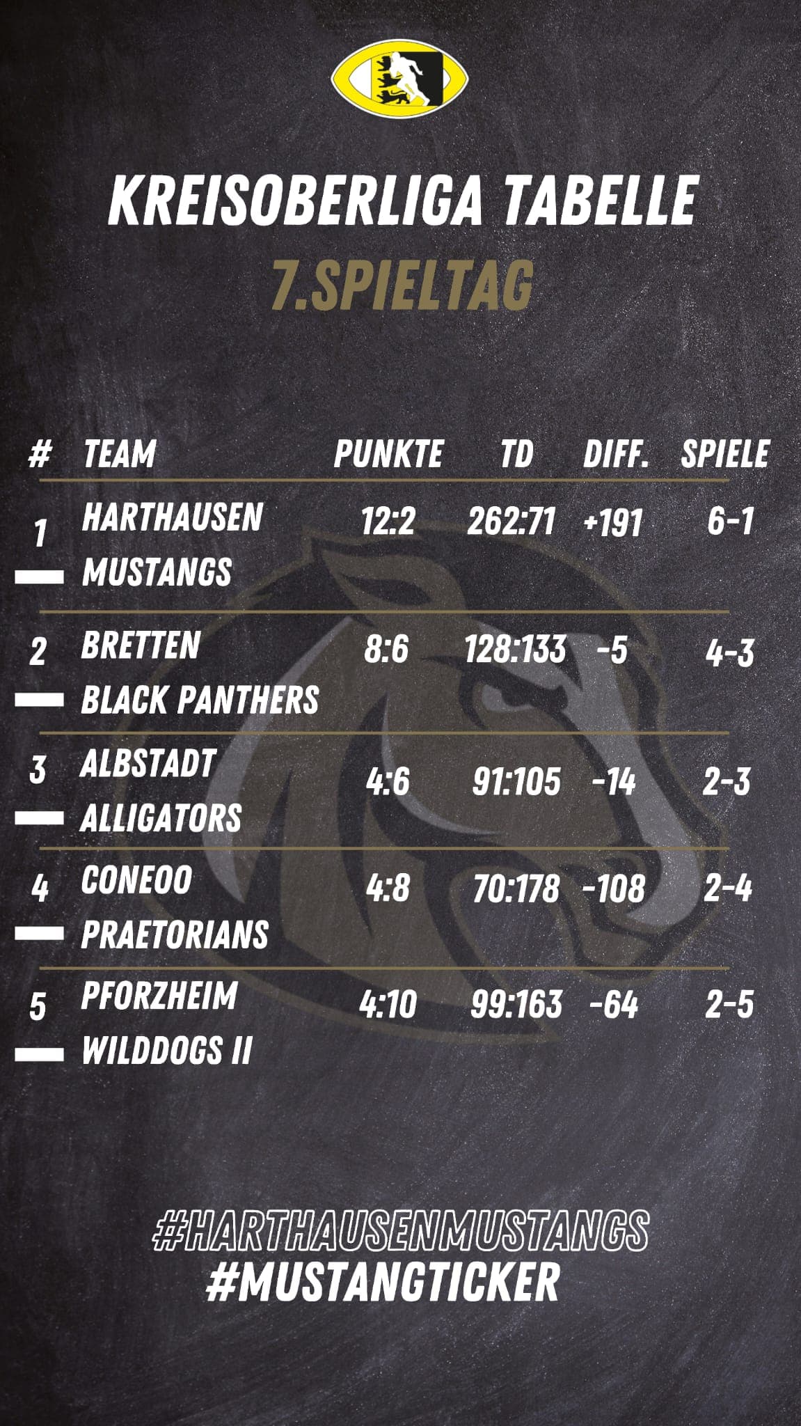 Auch das vorletzte Saisonspiel bei den Pforzheim Wilddogs 2 konnte mit einem klaren Sieg absolviert werden. Mit einem deutlichen 48:7 kamen die Harthausen Mustangs ein Spiel vor Saisonende als schon feststehender Meister der Kreisoberliga wieder zurück von ihrem Road Trip nach Pforzheim. Sollte das letzte Spiel am 30.07. bei den Crailsheim Praetorians ebenfalls mit einem Sieg enden wäre die Saison mit nur einer Niederlage perfekt . Der erneute Aufstieg ist also eingetütet. Die Fans der Harthausen Mustangs können sich in der nächsten Saison auf noch mehr Action am Brandfeld des TSV Harthausen freuen wenn die Mustangs in der Bezirksliga antreten um dort weiter für Furore zu sorgen.