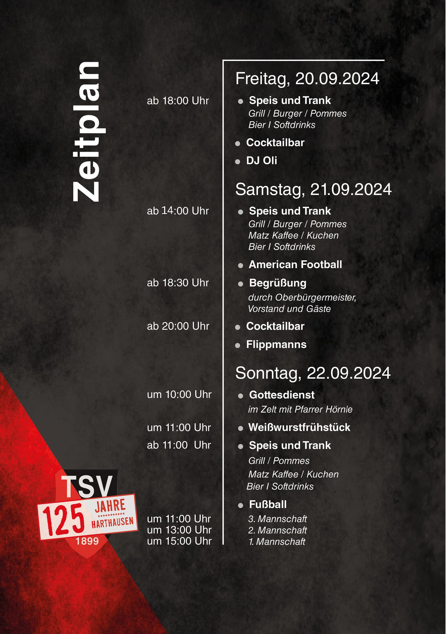 Samstag, 21.09.2024 Ab 14.00 Uhr Speis und Trank Ab 14.00 Uhr American Football Ab 18.30 Uhr Begrüßung durch Oberbürgermeister, Vorstand und Gäste Ab 20.00 Uhr Musik mit den Flippmanns